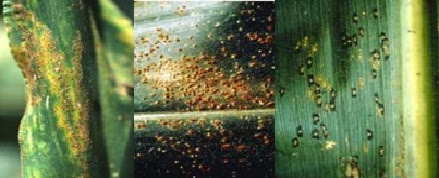 - Lúc đầu vết bệnh là những đốm chấm màu vàng sau đó lớn dần liên kết lại với nhau thành từng ổ, từng đám dầy bên trong chứa các bào tử màu vàng nâu là các bào tử hạ. Sau đó chuyển màu nâu đen, đây là giai đoạn của bào tử đông.