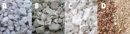 Các nguyên liệu chứa Canxi: (A) Đá vôi, (B) Dolimte, (C) Dolomite nung, (D) vỏ sò và bột vỏ sò