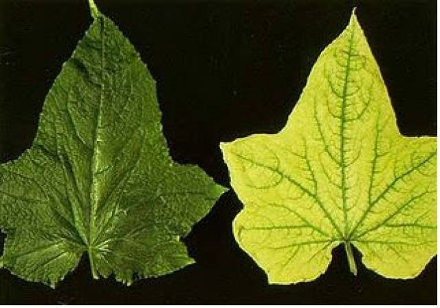 Thiếu sắt thường làm cho cây bị hiện tượng vàng lá do mất diệp lục, không có đốm, gân chính của lá còn xanh. Trường hợp thiếu nặng, toàn bộ thịt và gân lá chuyển vàng và cuối cùng trở thành trắng nhợt. Các lá non bị ảnh hưởng trước tiên, đỉnh và mép lá giữ mà xanh lâu nhất sau đó mới dần chuyển sang các lá già hơn.